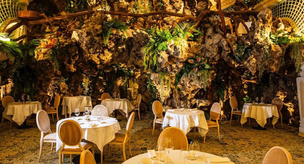 The dining room was theatrical: white tablecloths under dramatic rocky arches. It almost felt like eating inside a wine cellar.